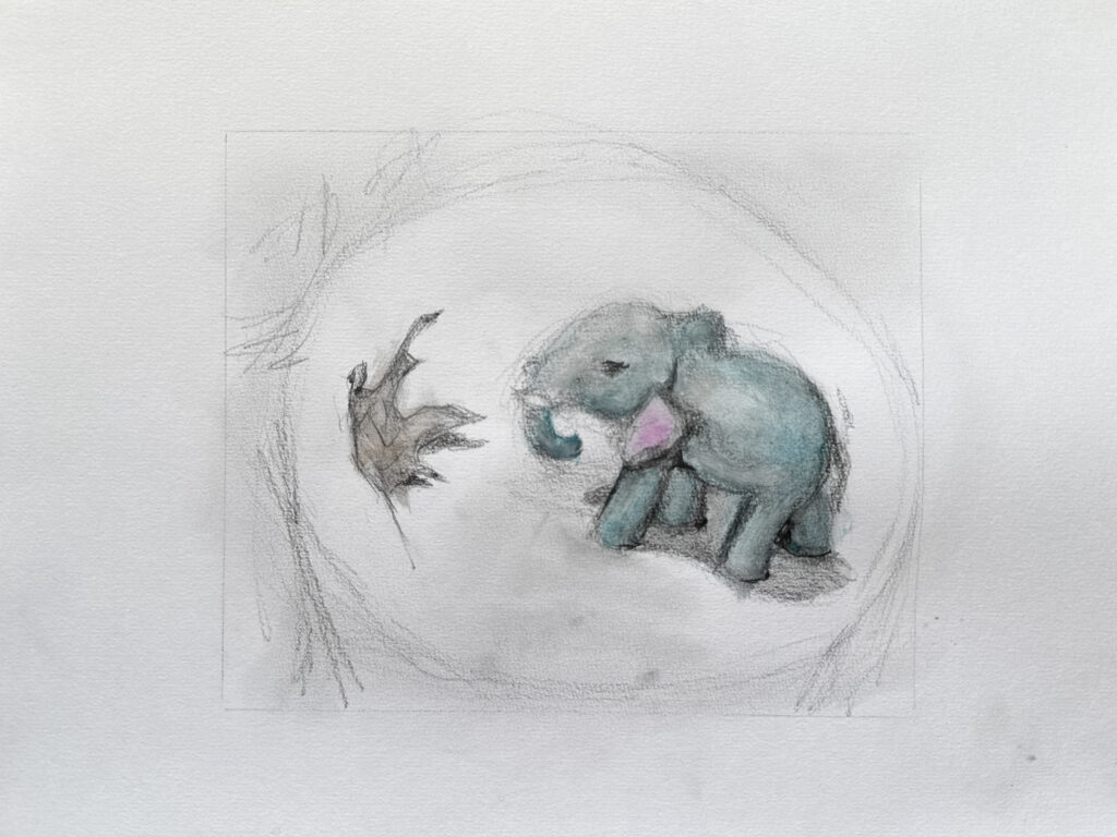 Looking at all the drawings at once, I feel the combinations of studies 2 and 3 worked best possibly because the interaction was more interesting as the juxtaposition makes a playful nod to the “hide and seek” game. In study 1, the owl on the branch comes together as a typical image even though the branch is a small stick. So on the one hand, it works, but on the other hand, it’s not such an interesting image. In study 4, the fact that the elephant is placed by the leaf is also an interesting contrast since we are wondering if the leaf is huge or the elephant tiny but the tension is not very effective and the two objects end up feeling separate drawings.