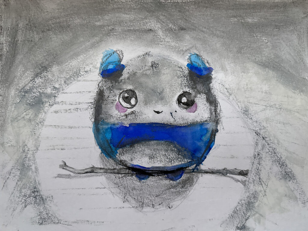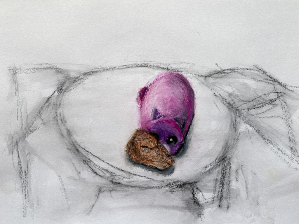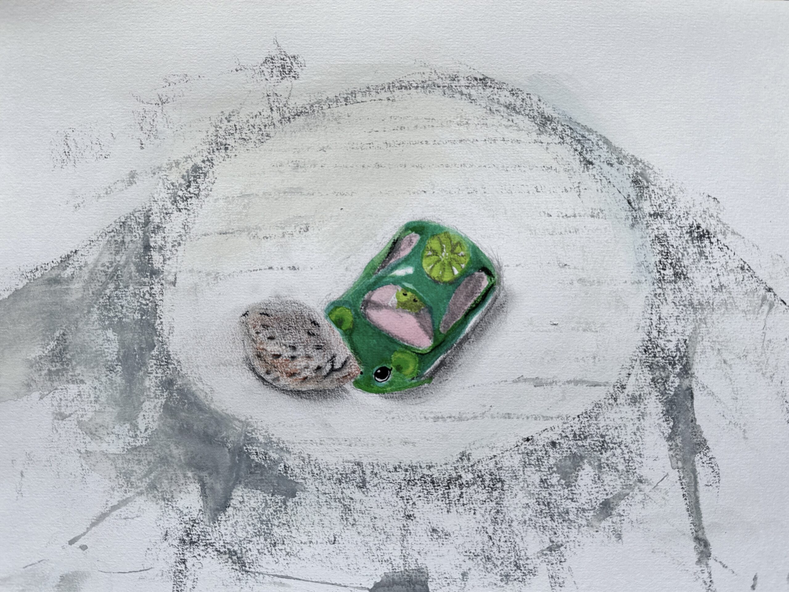 For this exercise I picked four handheld objects from a walk in the park, and four objects at home. I spent a long time thinking about what I could use for this and in the end, decided to pair a toy with an object from nature. I was inspired by Kenny II, a painting by Tory Day, a contemporary painter who paints ‘overlooked objects’ she finds in flea markets. I also think of toys as ephemeral, they are bright and new shiny plastic but quickly discarded as our children grow and end up as waste in nature. I often ponder about how we are caught in a vicious circle where toys make our children happy but also contribute to the plastic pollution that is ruining their planet. In terms of the approach, I was a little stumped by the idea of going into details versus keeping more gestural and freer in my mark-making. In the end, I opted to stay loose and explore materials in a more playful approach, using bright watercolour inks for the toys and graphite and Conté crayons for the objects from nature. I set the objects up on a round box covered with a white cloth.