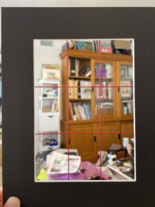 Looking back at Study no. 3, I felt I wanted to better convey the idea that this was a piece of furniture rather than a building. It occurred to me that I needed to better convey the perspective. So I made a little viewfinder with pieces of red embroidery thread to help me frame the scene.