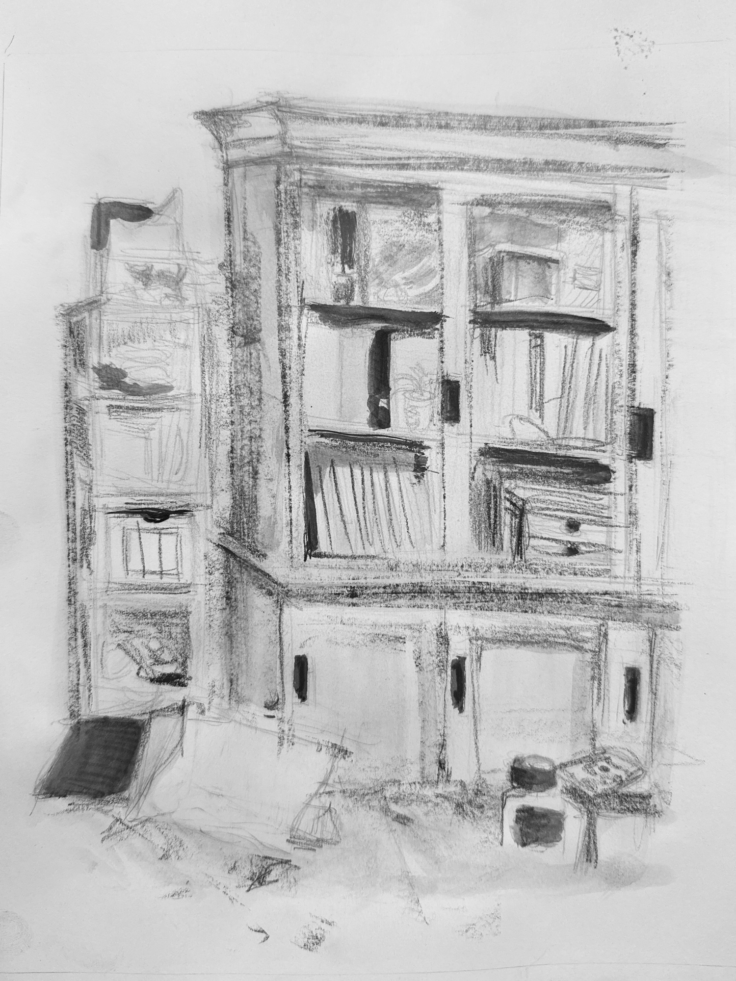 The main challenge was to frame the chaos and tame my mind looking at it. I suppose I started from a challenging place since it was so cluttered. What I realised however, is that I could use this as an input for and taking in the light and dark spots. It was useful to use the Graf Art blocks to help me get the scene in as opposed to a precise graphite pencil which would have led me to overprecise work.