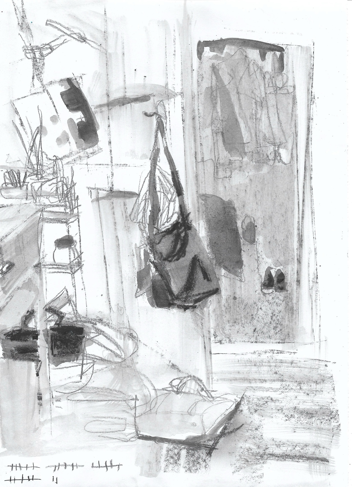 I am not sure I’m succeeded in communicating the feeling of the place. I can feel the mess and the oppression. The more I draw it, the more I want to tidy up! I get bogged down by it not “looking right” and somehow I feel the earlier studies were freer. The more I repeat this, the more stiff I feel I become. I’ll try to change medium for the next study.
