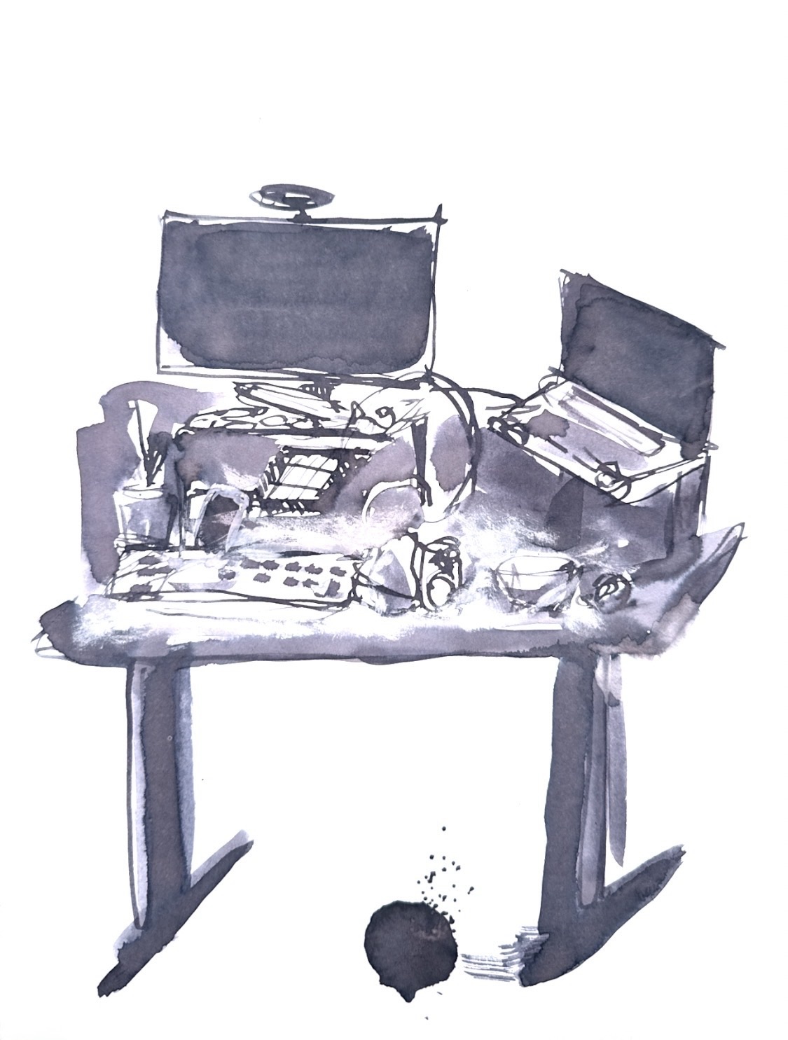 For this study, I picked a different point of view, a different subject, and a different medium. I used Sumi ink and a bamboo brush and pen. It was a little precarious (sitting on the sofa, drawing and inking on a board) and there was a spill but I quite liked it in the end, as a trace of the process! Hopefully the mess of my home office desk is also showing. Using a looser tool made me less anxious to get it accurate and tried to focus on the bold-loose angles of the triad! I ran out of time to create the full room. I edited the picture in Lightroom to keep true to the contrast and improve the presentation by removing the paper warps. I find it psychologically difficult to make studies on high quality materials.