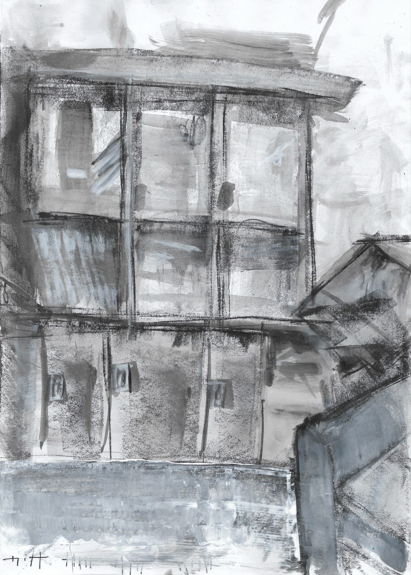 I feel a little angry and oppressed! The room is tiny and it’s over-crowded with stuff. Books, art materials, traces of art-making (mine and my daughter’s). I should feel happy about the place but truth is the mess is shouting at me everywhere, like a thousand pricks. I have a Chinese ink set somewhere but I can’t find it. Instead I found a set of three Art Graf blocks I had never opened. It was quite fun to use. Especially the black ‘black’. The white got muddied straight away so in the end I used a posca pen and acrylic ink to lighten some areas. I tried to squint but I felt comfortable and lacking skills at taking the gist. I am trying to be restrained but I’m making too many marks, too fast. I felt twenty minutes was a long time to be doing this and not overdo it. For sketch two, I might make it a little more fun and constrained. Twenty minutes of looking, and a loose mark every minute.